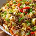 The aroma wafts through the kitchen, a warm embrace of soy sauce mingling with the rich scent of sautéed ground beef and aromatic garlic. As the vibrant colors of crunchy cabbage, bright bell peppers, and tender carrots dance together in the skillet, a sense of excitement fills the air. This isn’t just a meal; it’s a celebration of flavors that transforms a humble vegetable into a not-to-be-missed dish. Each bite offers a delightful crunch that contrasts beautifully with the savory, tender beef, making every forkful a joyous experience that leaves you craving more.