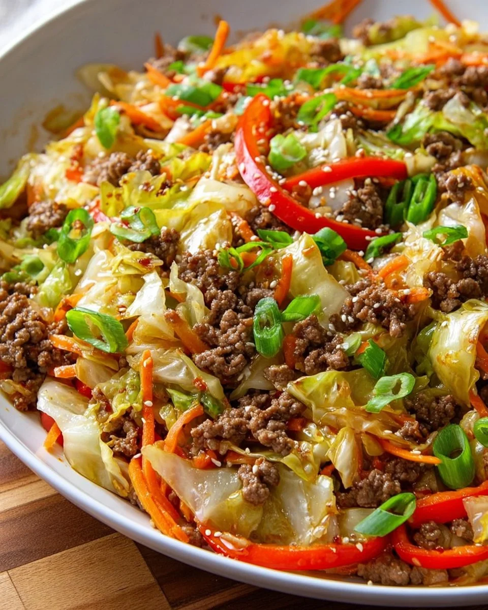 A vibrant and flavorful stir-fry featuring crispy cabbage, tender ground beef, and colorful vegetables, perfect for a cozy weeknight dinner.