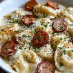 A warm and hearty casserole featuring golden-brown pierogies and savory kielbasa, all cooked to creamy perfection in a slow cooker.