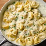 A comforting dish of creamy tortellini enveloped in a luscious, buttery sauce, punctuated with the sharp richness of grated Parmesan.