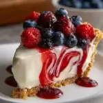 A delightful no-bake pie with a creamy filling, graham cracker crust, and a beautiful swirl of mixed berry jam.