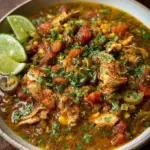 A warming bowl of Green Chile Chicken Stew featuring tender chicken, zesty green chilies, and vibrant vegetables simmered to perfection.