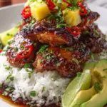 A vibrant and flavorful dish featuring grilled chicken thighs layered with jasmine rice, fresh pineapple, avocado, and colorful vegetables, all brought together with a sweet and tangy marinade.