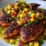 Once the grilled chicken rests for a few minutes, slice it and generously top with the mango salsa. The vibrant colors and fresh contrast make this dish a feast for the eyes.