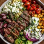 - Assemble the bowl: Start with a base of cooked grains, layer with steak slices, and add chickpeas, tomatoes, cucumber, red onion, olives, feta, and drizzle with tzatziki and vinaigrette.