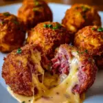 Crispy Reuben Balls filled with corned beef, Swiss cheese, and sauerkraut, served with a zesty dipping sauce.