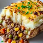 A comforting twist on classic shepherd’s pie, featuring baked potatoes stuffed with savory ground meat, colorful vegetables, and topped with creamy mashed potatoes.